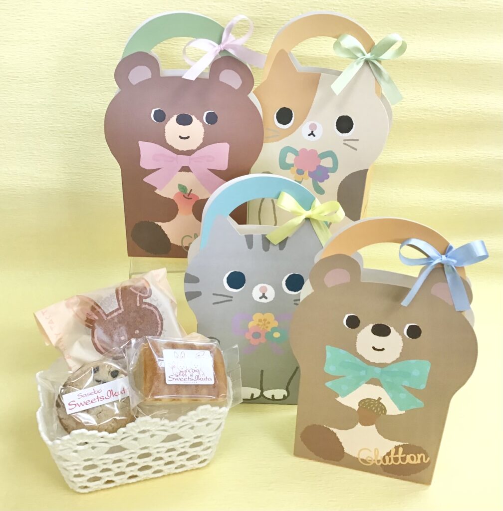 アニマルバック(福石店) 可愛らしい猫ちゃん・くまちゃん柄のギフトバック。 お子様へのプレゼントや手土産にいかがですか。 ※焼菓子の内容はイメージです。 こちらのギフトは福石店取り扱い商品です。 ご予約で他店舗での受け取りも可能です。 756円(税込) 取扱店舗:福石店 販売期間:通年 [ご注意]※掲載の商品は予告なく販売終了する場合があります。ご了承ください。 ※店舗によって取扱商品が異なる場合があります。詳しくはお尋ねください。