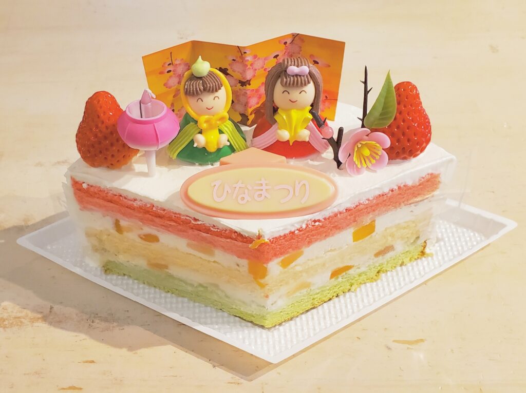 ひしデコレーション(季節限定) 季節限定のひし形のひな飾りのデコレーションケーキ ふわふわスポンジに生クリームと色々なフルーツをサンドしました。 3780円(税込)[直径20㎝] 取扱店舗:全店舗 販売期間:季節 [ご注意]※掲載の商品は予告なく販売終了する場合があります。ご了承ください。 ※店舗によって取扱商品が異なる場合があります。詳しくはお尋ねください。