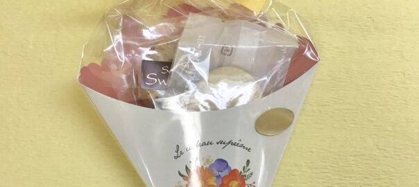 可愛らしいブーケラッピングのギフト。クッキー入り。