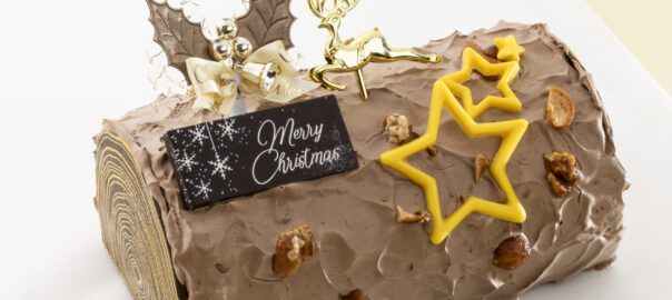 くるみ入りのやわらかチョコスポンジでチョコクリームとキャラメルクリームを包み込みました。