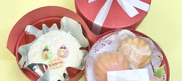 可愛らしいひな飾りのついたサンケーキとマドレーヌ・雛あられの2段重ねのお雛ギフト。